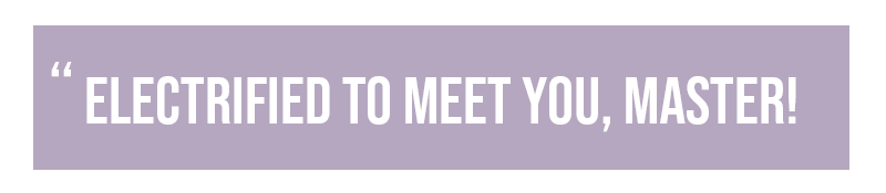 She has short hair, with a slight tint of lilac: the bangs are longer and with a fancy style, the strand on the right is longer and her face is split by a thinner tuft ending with a USB. She has two ribbons located to the sides of her head, and her eyes are designed to convey calmness and positivity, thanks to their specific coloring: a desaturated and light magenta (#e19ce7). On her face, right above the cheeks, she has two symbols: a plus (+) and a minus (-) which have the purpose of regulating the electricity in her body. Her clothes are reminiscent of her creator, beneath those she wears a dark bodysuit, whose shorts end at mid-thigh. On top of these capes she wears a short sleeveless purple kimono with a small neckline allowing a glimpse of the net-alike bodysuit’s upper part. She has a cuff on her right wrist and a long sleeve provided of a screen from which she adjusts voice functions or connects to the network. To keep it short, it’s her own computer.