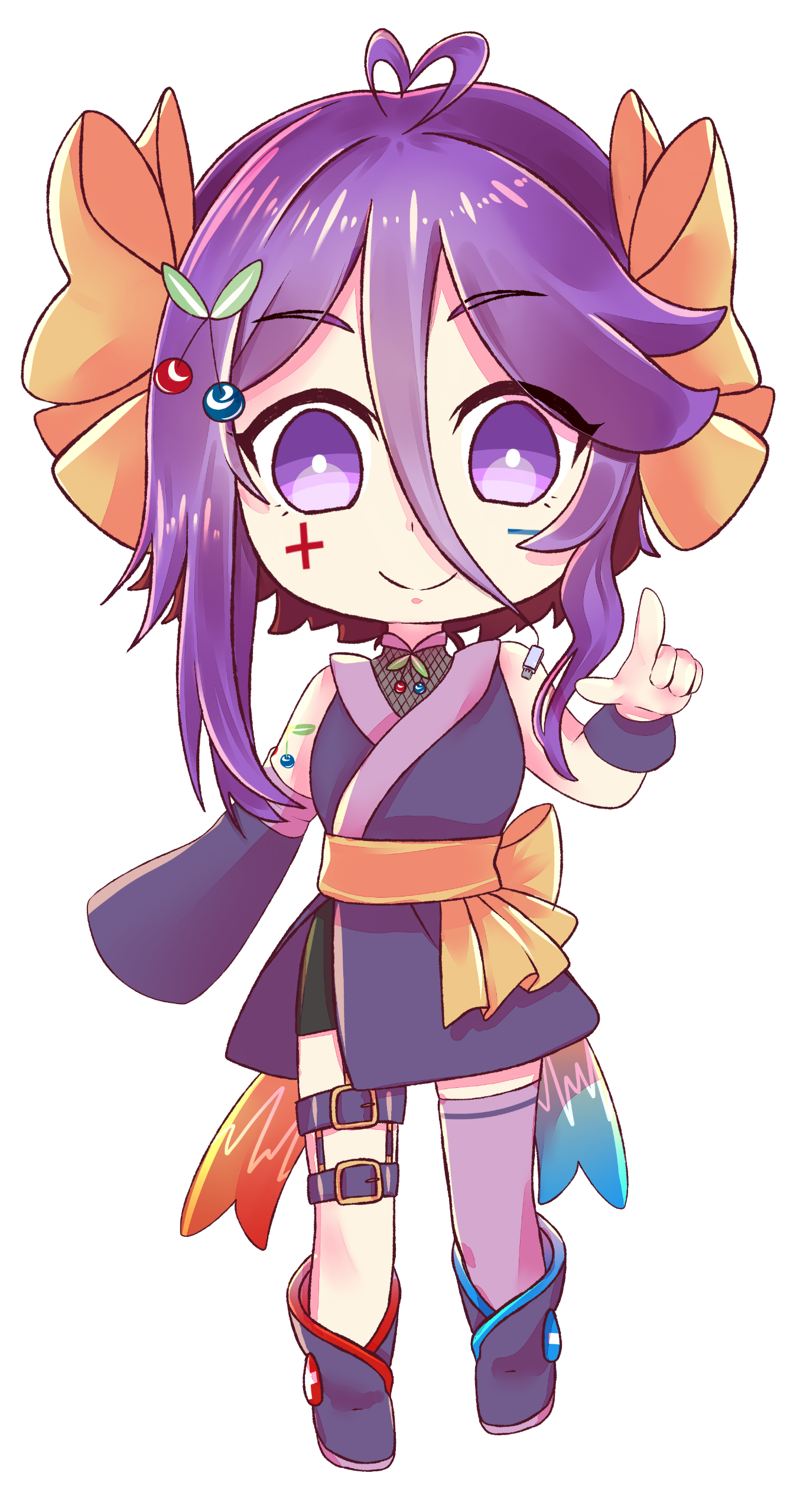 She has short hair, with a slight tint of lilac: the bangs are longer and with a fancy style, the strand on the right is longer and her face is split by a thinner tuft ending with a USB. She has two ribbons located to the sides of her head, and her eyes are designed to convey calmness and positivity, thanks to their specific coloring: a desaturated and light magenta (#e19ce7). On her face, right above the cheeks, she has two symbols: a plus (+) and a minus (-) which have the purpose of regulating the electricity in her body. Her clothes are reminiscent of her creator, beneath those she wears a dark bodysuit, whose shorts end at mid-thigh. On top of these capes she wears a short sleeveless purple kimono with a small neckline allowing a glimpse of the net-alike bodysuit’s upper part. She has a cuff on her right wrist and a long sleeve provided of a screen from which she adjusts voice functions or connects to the network. To keep it short, it’s her own computer.