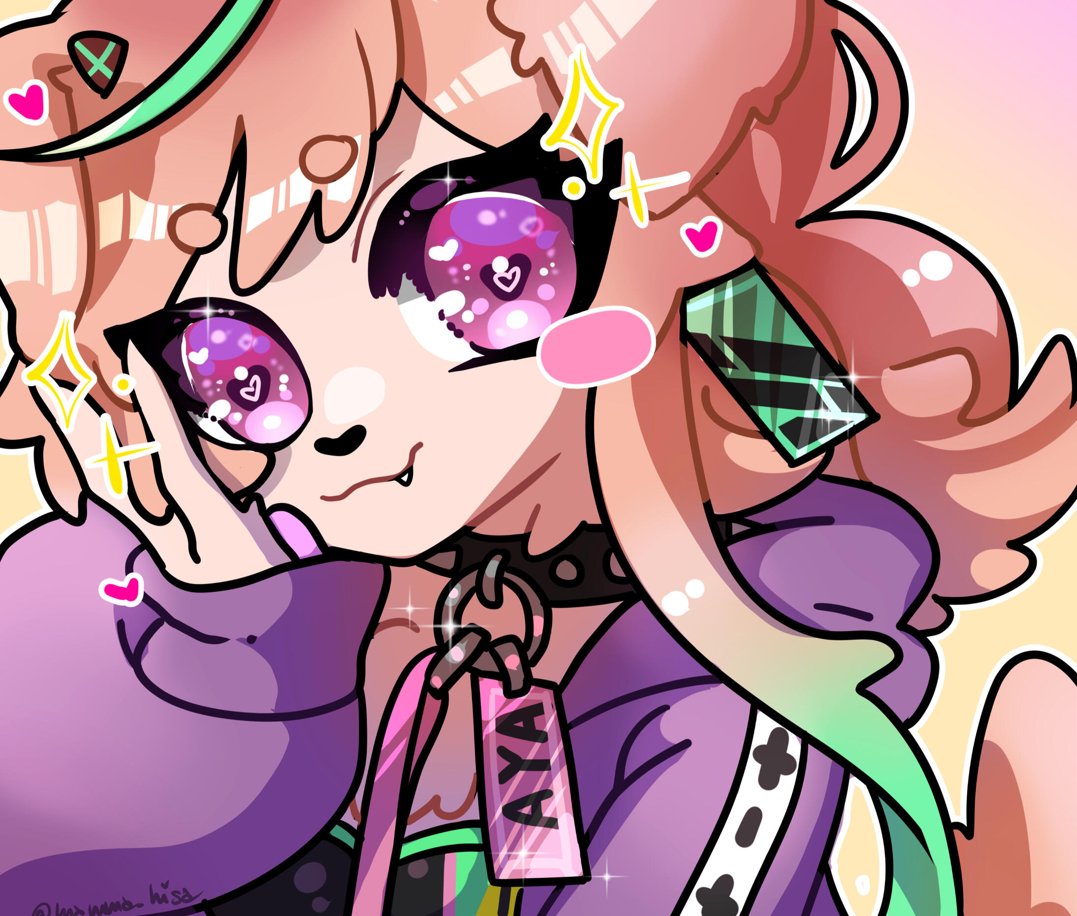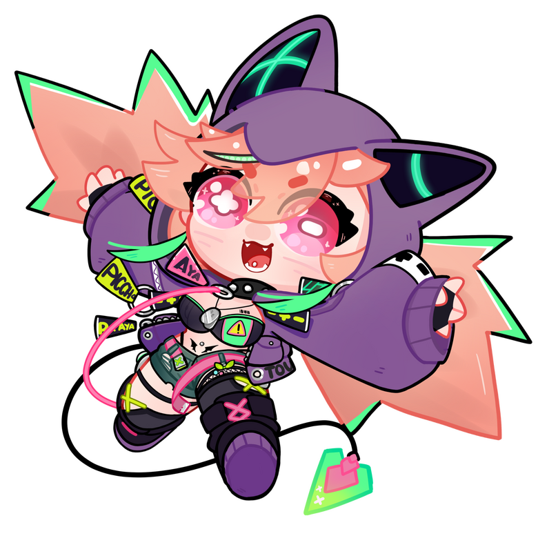 The collar with the studs and the tag that hangs on the ear with the inscription AYA are very important of her design and lore, they are the release of the identity and personality of doctor Picchan creator of all picchloids;