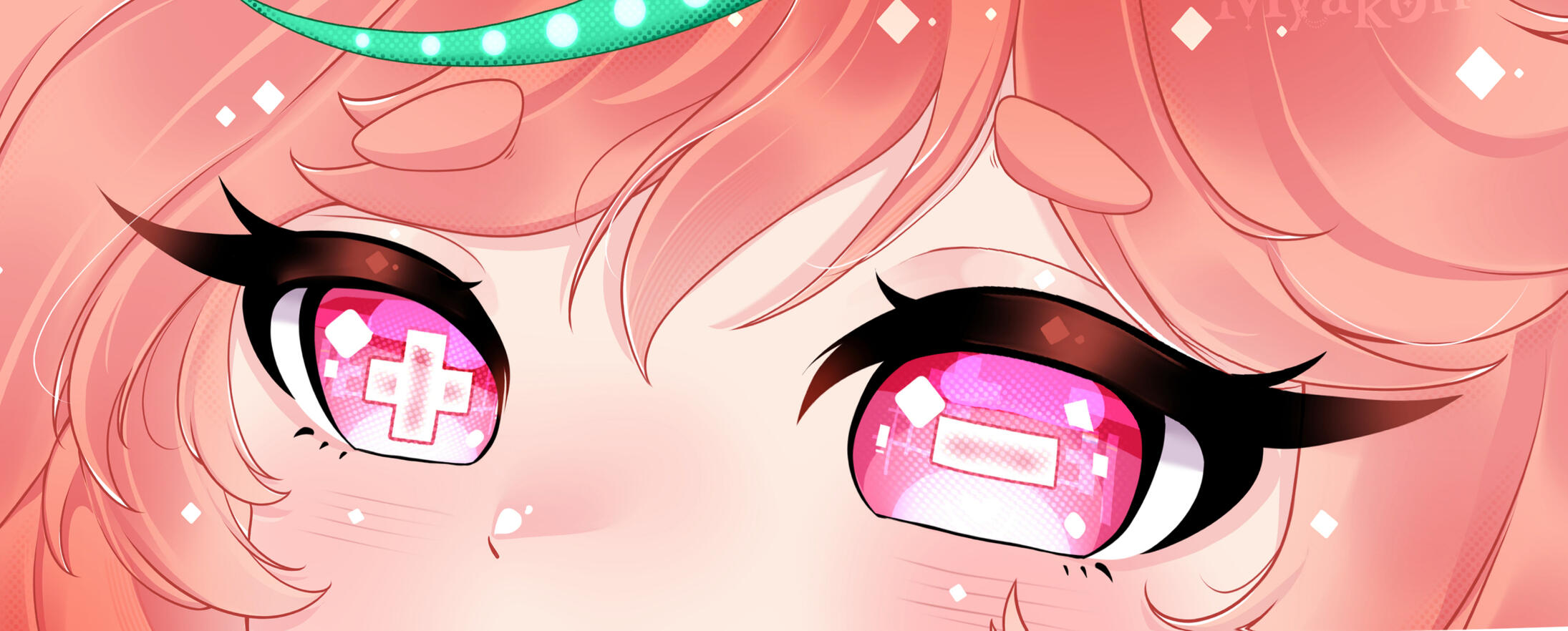 In her eyes, there is a + and a - sign of the cybernetic implementations in her body;