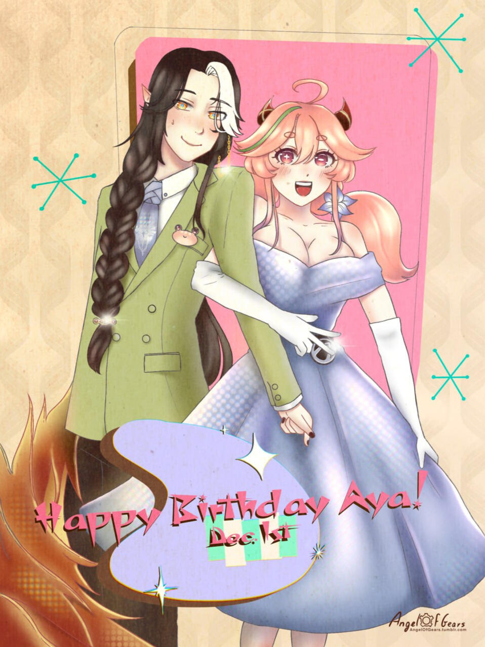 Her name AYA, is extracted from several kanji that are pronounced the same, such as 彩 (“color”) or 綾 (“project”);